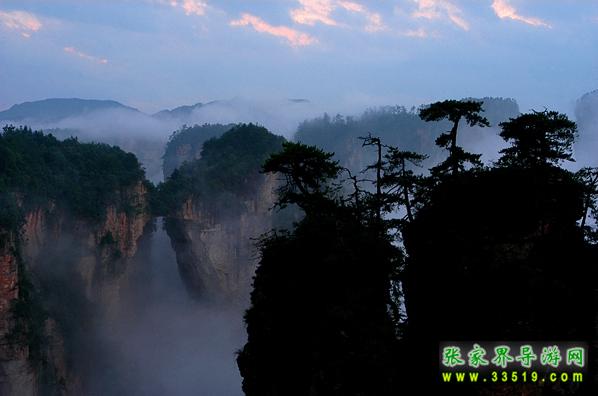 在“后花園”的對(duì)面,是一座巍峨的山巒,山上古木參天,遮天蔽日。森林中常有野山羊出沒,夜深人靜之際,常能聽到野羊羔“咩洋”地叫聲,因此被稱作“羊寨”。民國時(shí)期,此地曾為土匪占領(lǐng),直到現(xiàn)地,山上還殘留有卡門、暗堡、斷壕、屋場(chǎng)、水井、碓臼、磨坊等殘跡。粗大的松樹上還留有土匪當(dāng)年留下的“V”字型標(biāo)志。站在“山寨”上,舉目眺望,可看見金鞭溪全景,只見一條美麗的溪水從數(shù)百座石林中緩緩穿過,顯得是那樣的幽靜、和諧。從“后花園”向前步行約100米,便是袁家界又一處絕世奇觀——迷魂臺(tái),走上迷魂臺(tái),只見上百座山巒拔地而起,峰涌而至,它們姿態(tài)萬千、氣勢(shì)非凡;有的似“天狗望月”,有的像“海螺出水”;有的像“將軍列隊(duì)”,有的如“一柱擎天”。幾道山坳和屏障將這些山巒有序的分開,使這些石峰更顯得層次分明,井然有序,在萬道霞光的點(diǎn)綴下,顯得蔚為壯觀,不同凡響。這更像是一幅畫家筆下的水墨丹青,“迷魂臺(tái)”攬勝,真宛如仙境神游啊。