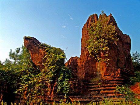 紅石林位于茄通和斷龍山鄉(xiāng)境內(nèi),方圓上萬(wàn)公頃,精華景觀達(dá)數(shù)百公頃。那遍布的紅彩奇石造型各異,姿態(tài)萬(wàn)千,或依山而立,或拔地而起,古樸秀雅,氣勢(shì)宏偉,身臨其境,恍如仙境。一尊高 12.6米的擎天石柱,猶如一東方巨人,指點(diǎn)江山;巨石對(duì)面,另一石則婀娜多姿,秀麗動(dòng)人。另有一山頭遍布紅石,或高或低,或長(zhǎng)或短,游人入此,頓覺(jué)撲朔迷離,難覓來(lái)路。入另一處石林,但見(jiàn)如墻似垣,高度不大,但排列組合得與樓蘭古城布局相差無(wú)幾。這里所有的石頭都披著一層細(xì)密的皺褶,如珊瑚礁一般,讓人想起幾萬(wàn)年前這里是一片浩闊的大海,海浪時(shí)時(shí)轟鳴著一波波沖擊著礁石。