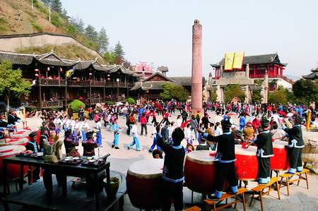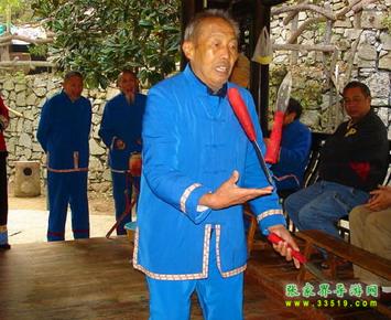 三棒鼓,唐代稱三仗鼓,明沈行符《顧曲雜言》 曰:“吳下何來有打三棒鼓乞錢者,余幼時有見之也, 起于唐咸通中(公元865年)”約于明代傳入本境, 并逐漸成為群眾增聞樂見的民間藝術(shù)形式。每年春節(jié) ,藝人們結(jié)伴走村竄寨拜年,表演對象不分貧富,戶 戶必到。如遇貧寒之家,表演者將別家贈送禮品相送 ,意在人人過節(jié)歡喜。充分體現(xiàn)出土家族人熱情好客 ,心地善良的民族性格,對加強民族團(tuán)結(jié)有一定作用 。 三棒鼓通常由三至五人組成,一人擊鼓唱詞,一 人鑼鈸配樂,一人耍花棒。花棒三根,長一尺,舞者 左右手各持一根,將另一根拋在空中,左右開弓,擊 打空中花棒使之不落地。也有以刀代棒,以五刀代三 棒的技藝。技藝高強者,突然把刀拋得極高,來一個 眼花繚亂,不禁稱絕。打三棒鼓,通常有“鬧春耕” 、“收割打場”、“慶豐收”、“拜年節(jié)”四套,分 “鯉魚跳龍門”、“玉女穿梭”、“板巖漂灘”等項 目。打三棒鼓技巧性強,表演時需高度集中,用力適 當(dāng),貫通一氣,并與演唱者默默配合。