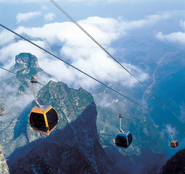 ②、張家界天門山索道為全世界最長的觀光客運索道,索道線路斜長7455 米,索道運行速度為每秒 6 米,單程運行時間約28分鐘。上、下站水平高差1279米主要設(shè)備均由法國POMA公司原裝進口,索道鋼繩來自于法國, 98 個吊廂來自瑞士 CWA 公司,單個造價高達 20 萬元人民幣。有嚴(yán)重心臟病或恐高癥等患者不建議乘坐;