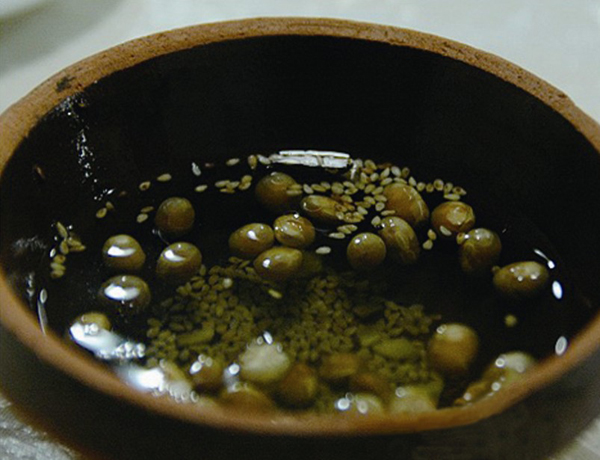 靖港人吃姜鹽芝麻豆子茶早已成為當?shù)氐娘L俗習慣。將生姜搗碎,加入少量食鹽和炒熟的芝麻、黃豆或黑豆,一齊倒入茶罐中,然后手提茶罐搖勻倒入茶杯待客,香脆可口,味不亞于“湘西擂茶”。