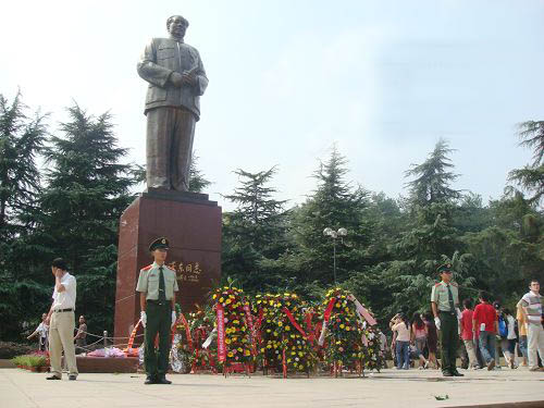 毛澤東銅像位于韶山沖的中心,紀念館、毛氏宗祠與韶山賓館之間。銅像區(qū)占地5200平方米,是經(jīng)中共中央批準興建紀念毛澤東同志誕辰100周年的重點獻禮工程。這里原是一片沃野,地勢平坦開闊,周圍群山拱護。韶蜂在遠處,高峻挺拔,云富坨大山巍峨雄壯,十八羅漢山逶迤綿長,黑石寨鐵骨錚錚。在山的襯托下,銅像更顯得氣勢磅礴。