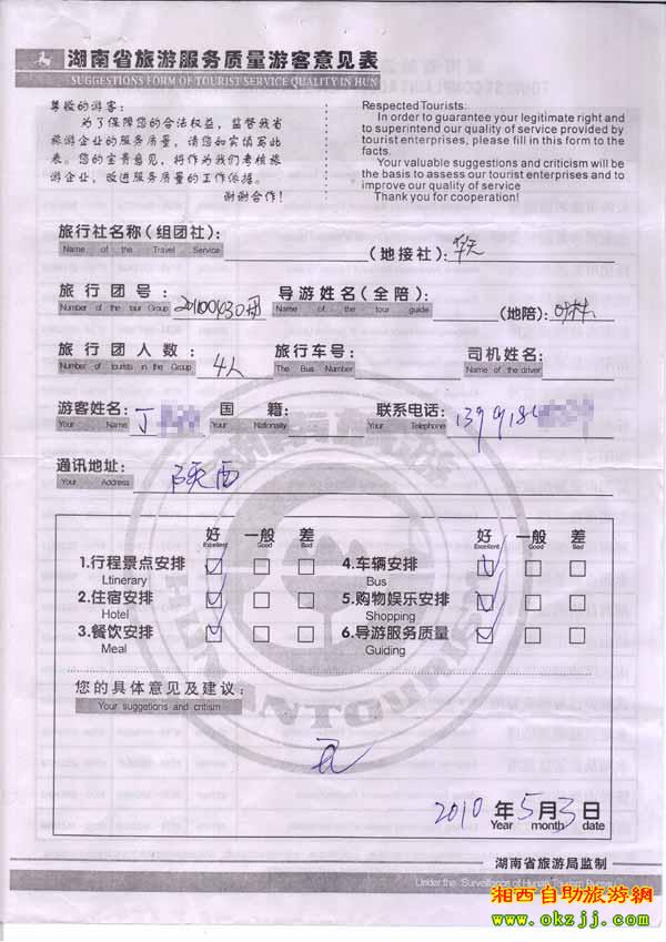 2010年5月3日陜西丁先生一行4位旅游質量反饋
