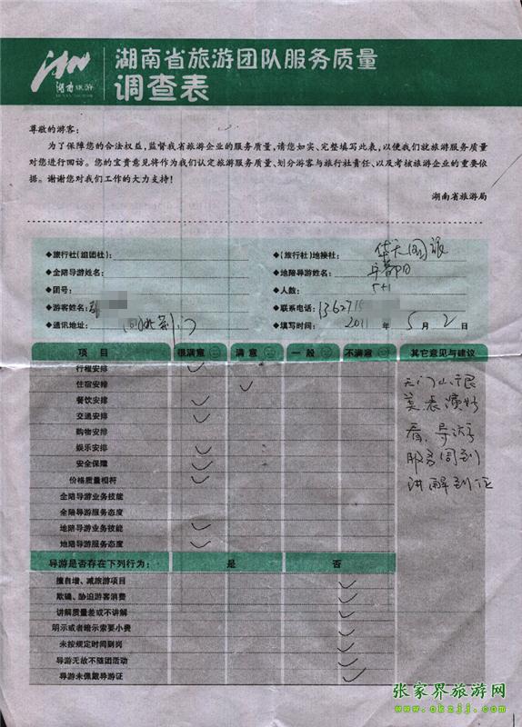 2011年5月2日張小姐一行6人旅游質(zhì)量反饋:天門山很美,表演好看,導(dǎo)游服務(wù)周到,講解到位