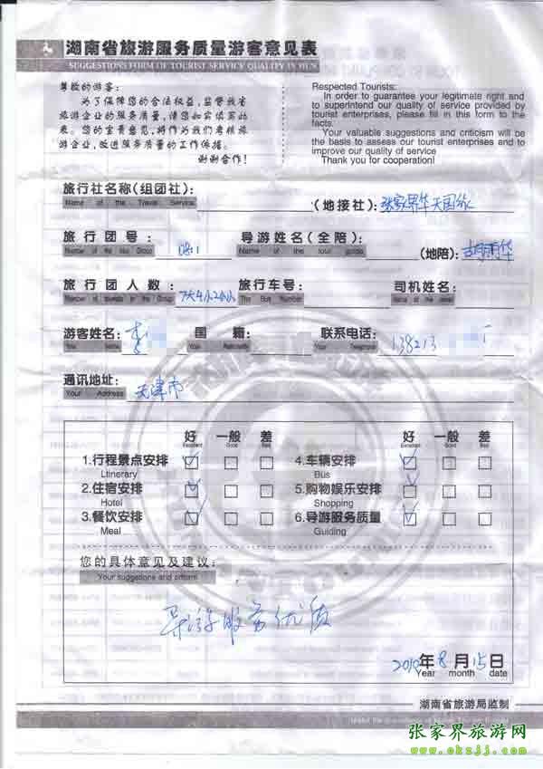 2010年8月15日天津李胡先生一行13位旅游質(zhì)量反饋:導(dǎo)游服務(wù)優(yōu)質(zhì)