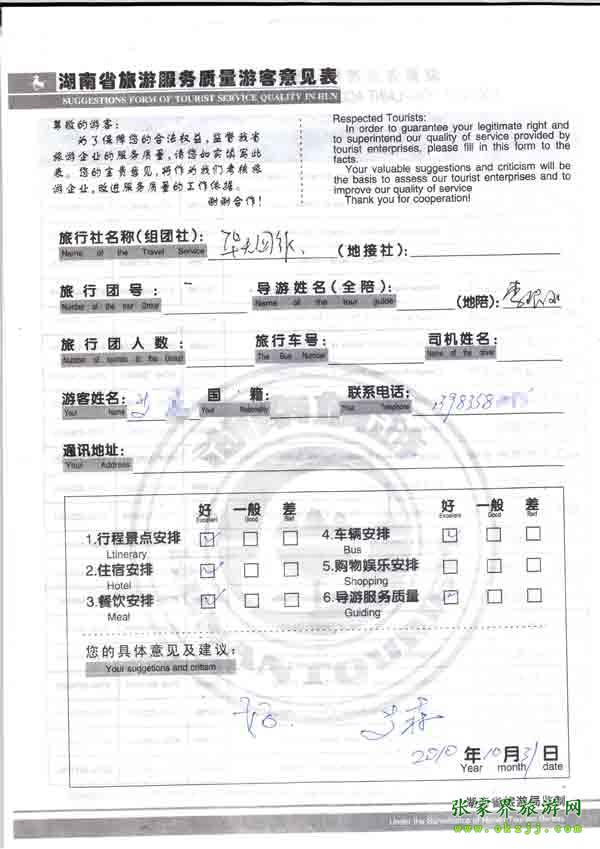 2010年10月31號艾先生旅游質(zhì)量反饋:好!