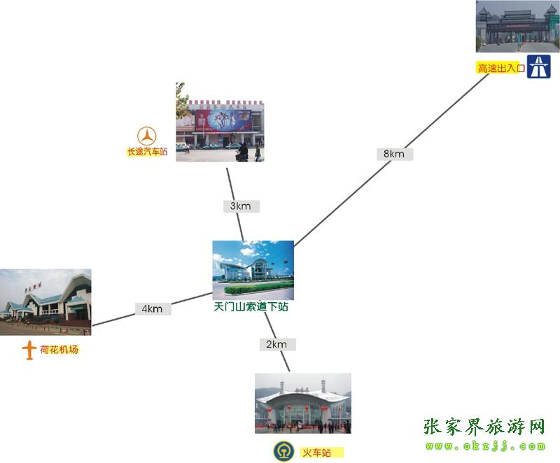 ![]() 天門山索道下站距荷花機(jī)場(chǎng)3公里,距火車站0.5公里,距長(zhǎng)張高速公路出口也僅8公里之遙。景區(qū)周圍另有張羅、張清、張桑等公路通往省內(nèi)各個(gè)方向。進(jìn)城公路和市內(nèi)主要道路均安裝了交通指引標(biāo)示,寬暢的道路和清晰的指引路牌使得游客抵達(dá)天門山特別方便順暢。